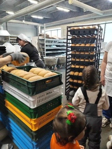 Дети своими глазами увидели этапы рождения хлеба, рассматривали тесто, наблюдали, как оно подходит, как садят хлеб в печь и вынимают готовые булки.