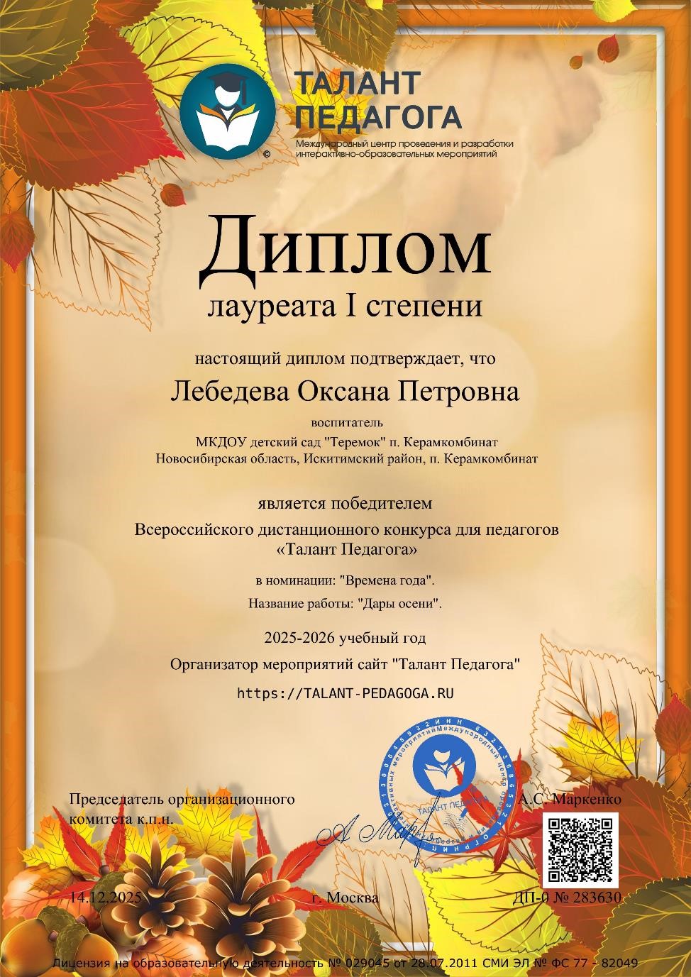Всероссийский дистанционный конкурс для педагогов "Талант педагога", номинация "времена года"